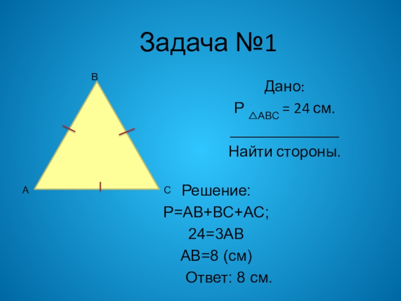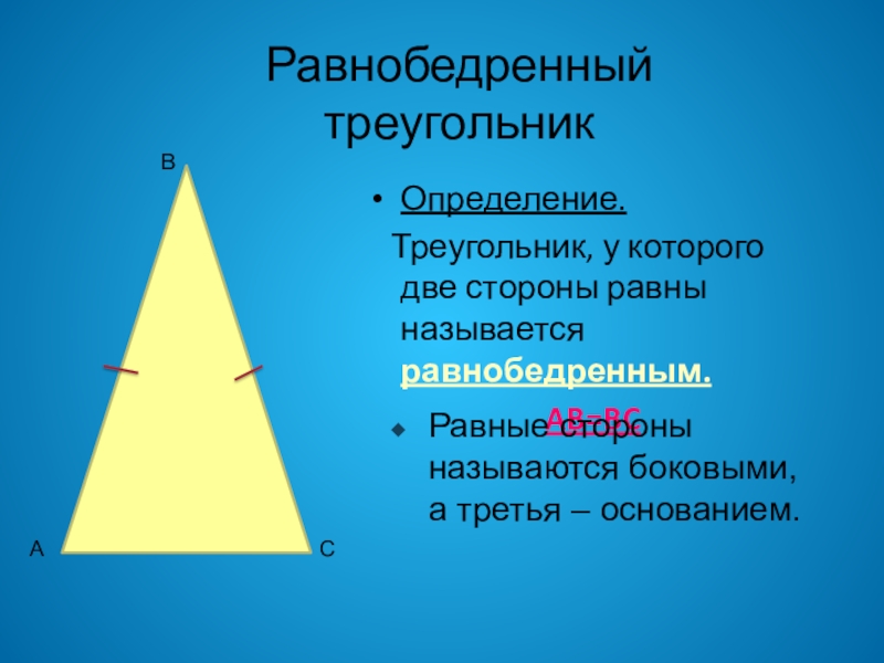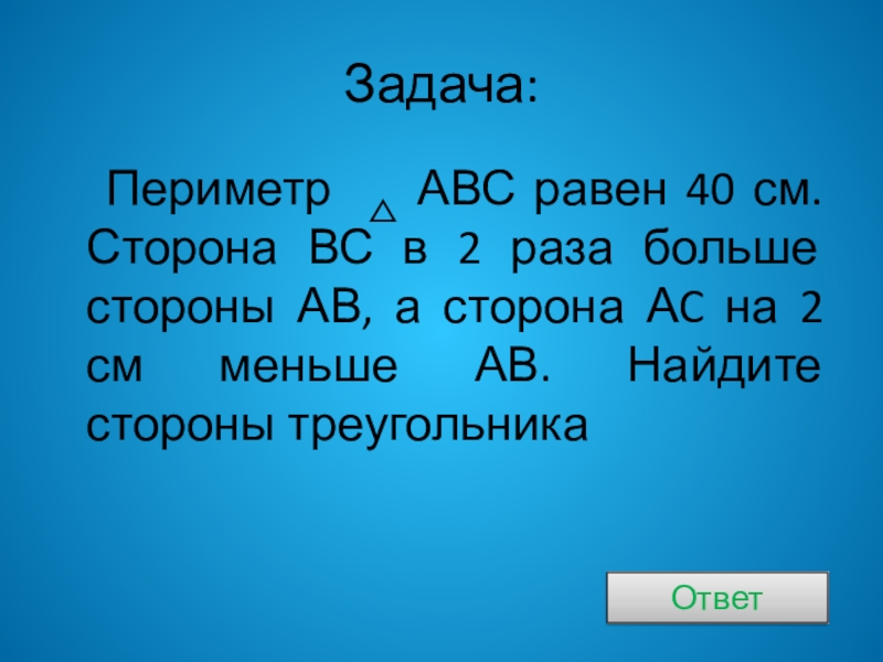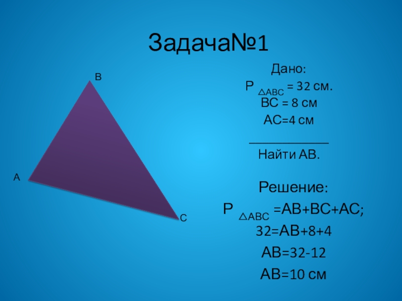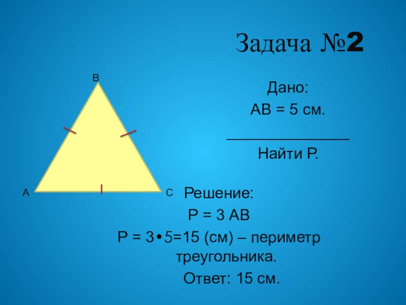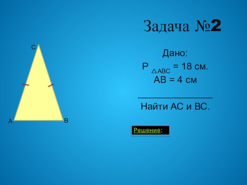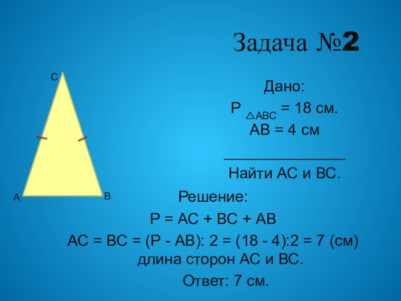 АС = ВС = (Р - АВ): 2 = (18 - 4):2 = 7 (см) длина сторон АС и ВС.