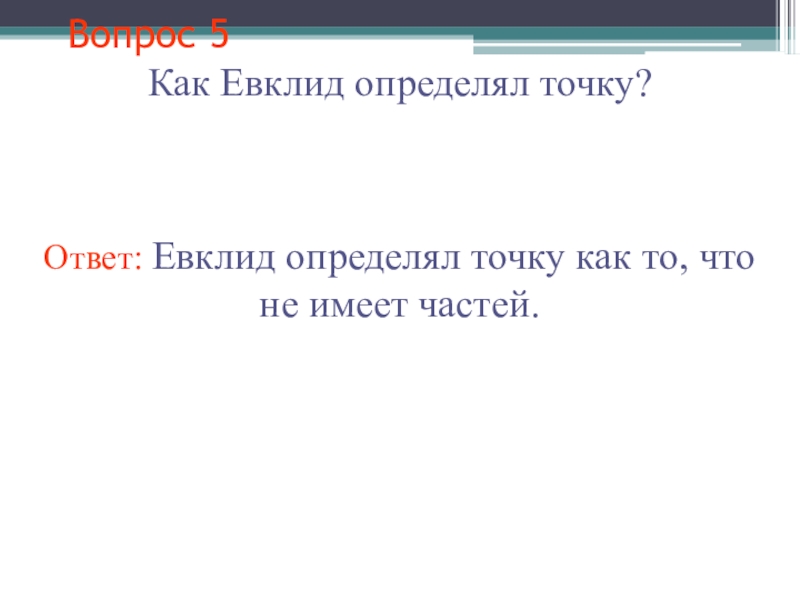 Древнегреческий ученый Евклид, впервые давший научное изложение геометрии, в своей книге "Начала" определял точку как то, что не имеет частей.