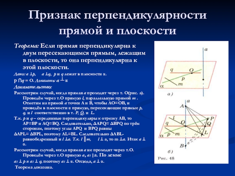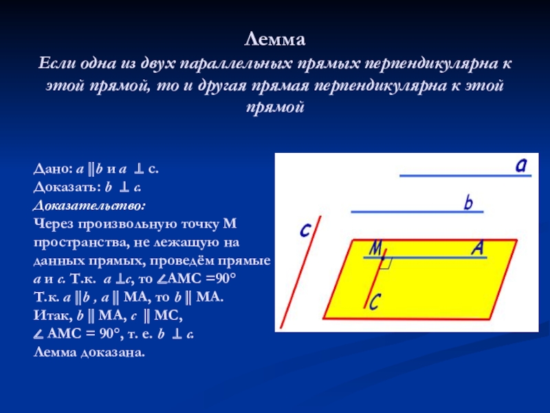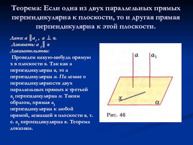 Проведем какую-нибудь прямую х в плоскости α. Так как а перпендикулярна α, то а перпендикулярна х. По лемме о перпендикулярности двух параллельных прямых к третьей а1 перпендикулярна х. Таким образом, прямая а1 перпендикулярна к любой прямой, лежащей в плоскости α, т.е. а1 перпендикулярна α. Теорема доказана.