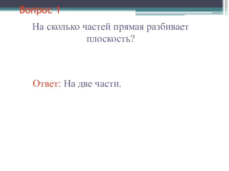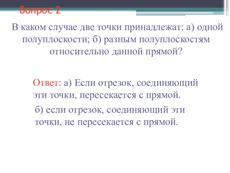 Каждая прямая на плоскости разбивает эту плоскость на две части. При этом если две точки принадлежат разным частям, то отрезок, соединяющий эти точки, пересекается с прямой. Если две точки принадлежат одной части, то отрезок, соединяющий эти точки, не пересекается с прямой.