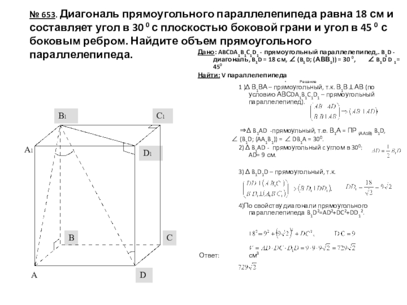Дано: ABCDA1B1C1D1 - прямоугольный параллелепипед,. B1D - диагональ, B1D = 18 см, ∠ (B1D; (АВВ1)) = 30 0, ∠ B1D D 1 = 450
