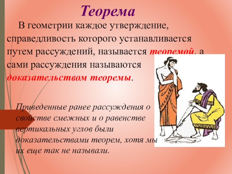 Приведенные ранее рассуждения о свойстве смежных и о равенстве вертикальных углов были доказательствами теорем, хотя мы их еще так не называли.