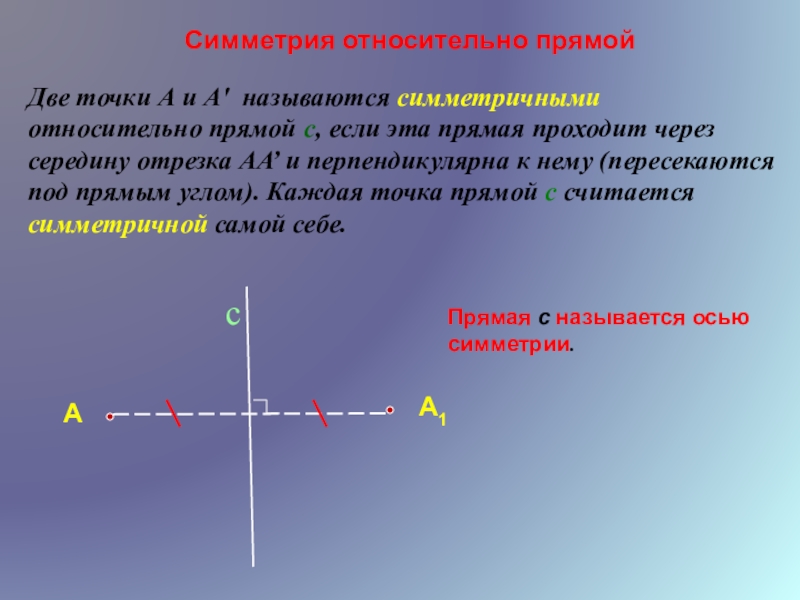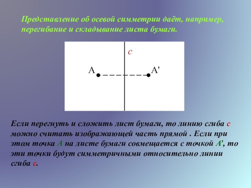 Если перегнуть и сложить лист бумаги, то линию сгиба с можно считать изображающей часть прямой . Если при этом точка А на листе бумаги совмещается с точкой А’, то эти точки будут симметричными относительно линии сгиба с.