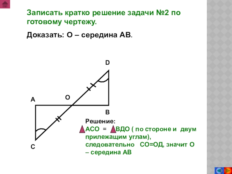 АСО = ВДО ( по стороне и двум прилежащим углам), следовательно СО=ОД, значит О – середина АВ