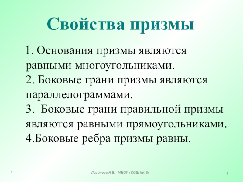 Многоугольники, лежащие в параллельных плоскостях, называют основаниями призмы, а остальные грани - боковыми гранями.