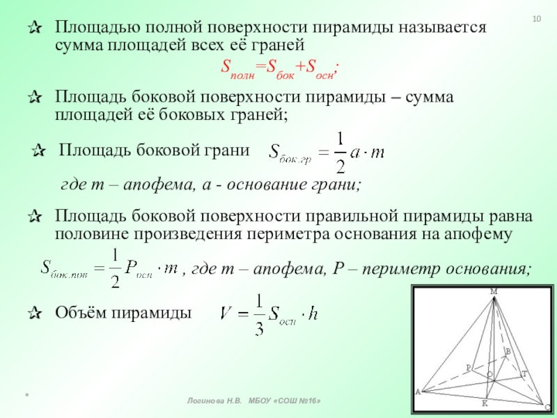 Перпендикуляр SO, опущенный из вершины на основание, называется высотой пирамиды и обозначается h.