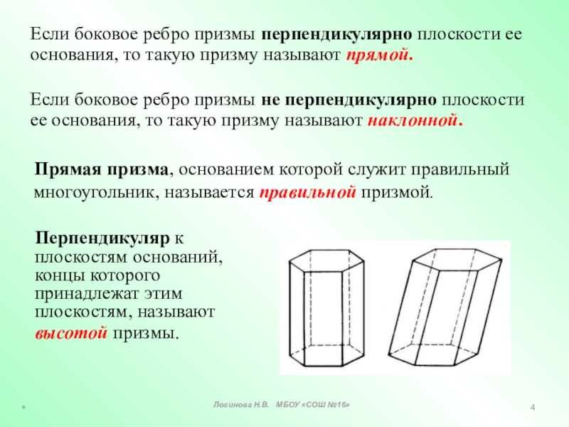 Если боковое ребро призмы не перпендикулярно плоскости ее основания, то такую призму называют наклонной.