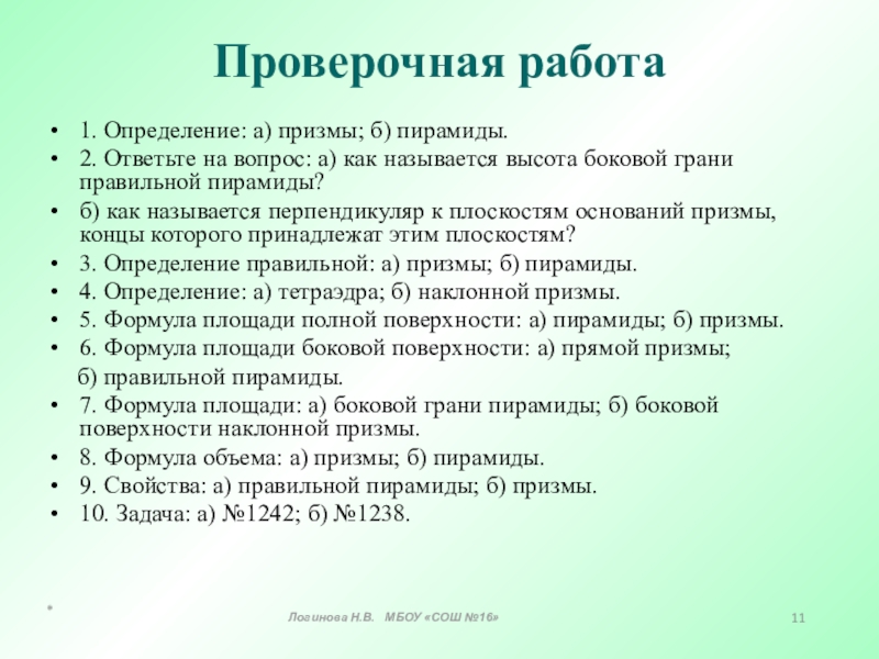 1. В правильной пирамиде все двугранные углы при основании равны.