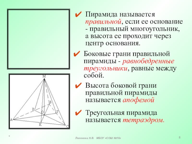 4. Все боковые грани правильной пирамиды равные равнобедренные треугольники.
