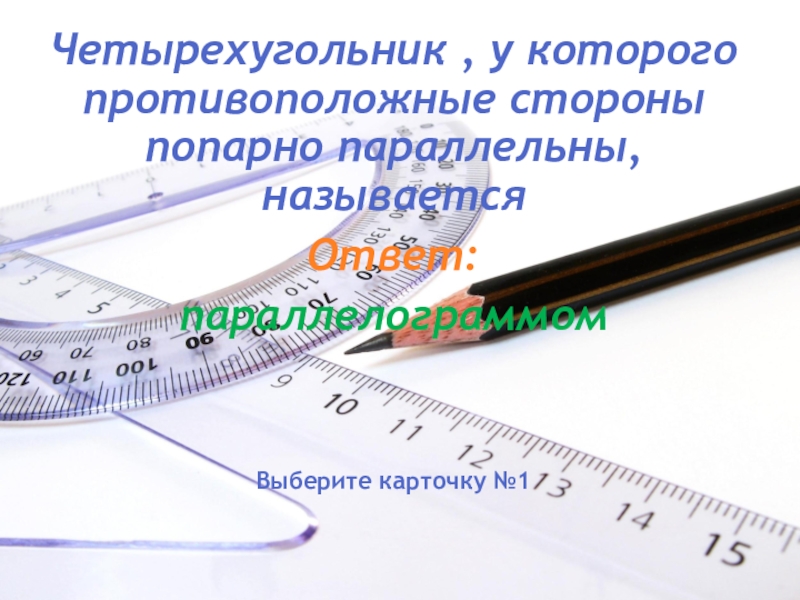 Четырехугольник , у которого противоположные стороны попарно параллельны, называетсяОтвет:параллелограммомВыберите карточку №1
