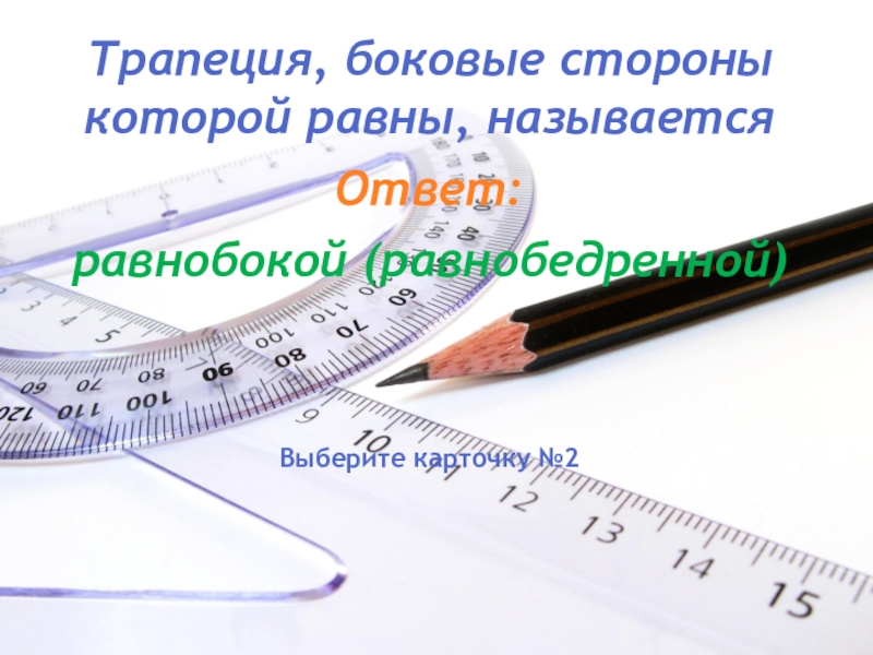 Трапеция, боковые стороны которой равны, называетсяОтвет:равнобокой (равнобедренной)Выберите карточку №2