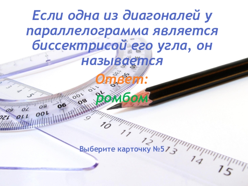 Если одна из диагоналей у параллелограмма является биссектрисой его угла, он называетсяОтвет:ромбомВыберите карточку №5