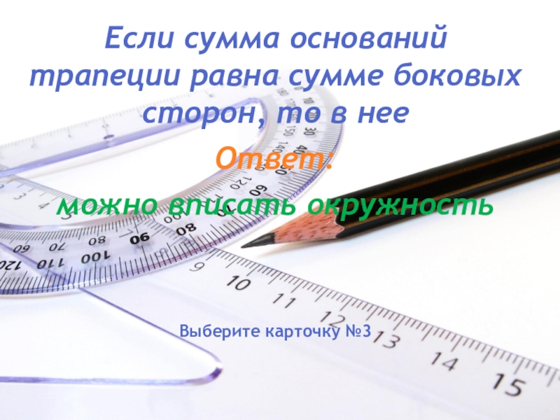 Если сумма оснований трапеции равна сумме боковых сторон, то в нееОтвет:можно вписать окружностьВыберите карточку №3