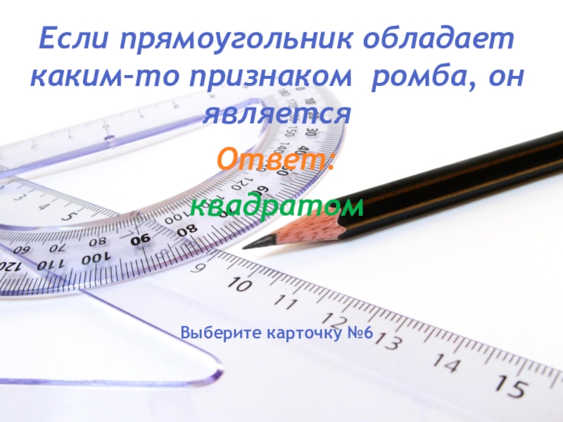 Если прямоугольник обладает каким–то признаком ромба, он являетсяОтвет:квадратомВыберите карточку №6