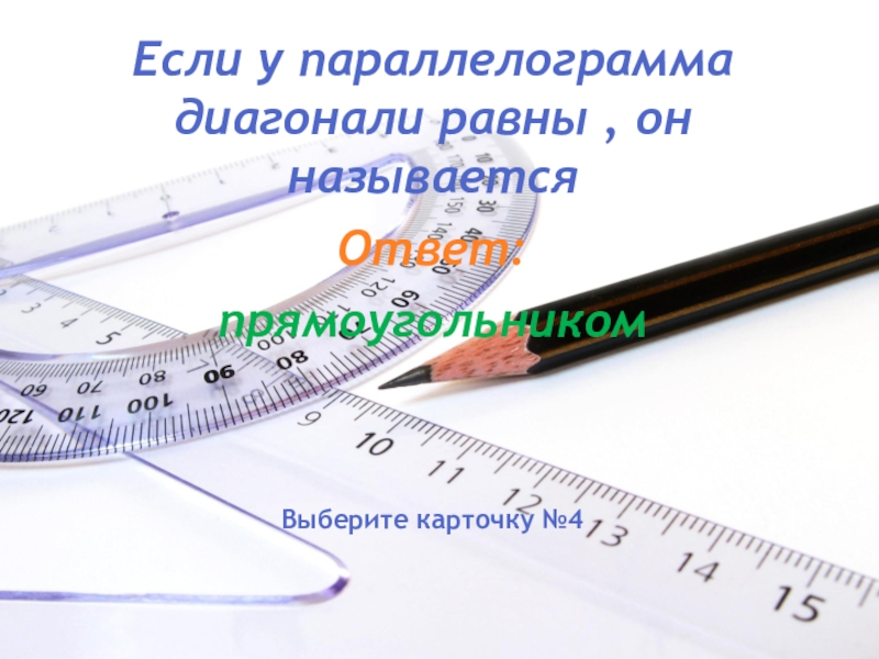 Если у параллелограмма диагонали равны , он называетсяОтвет:прямоугольникомВыберите карточку №4