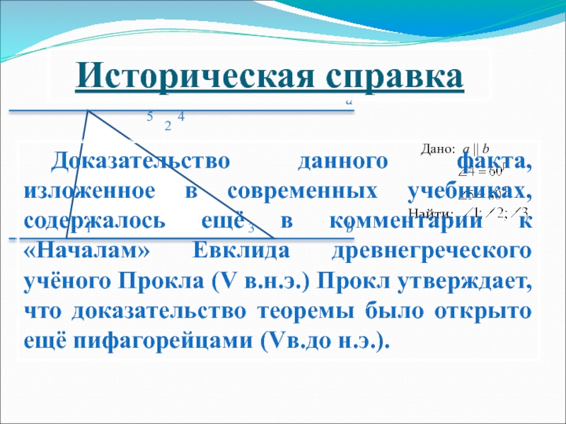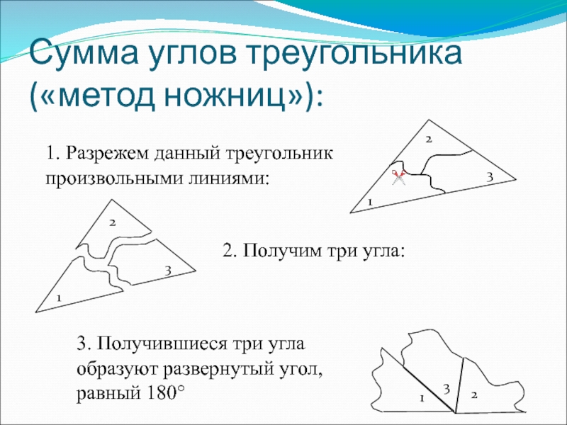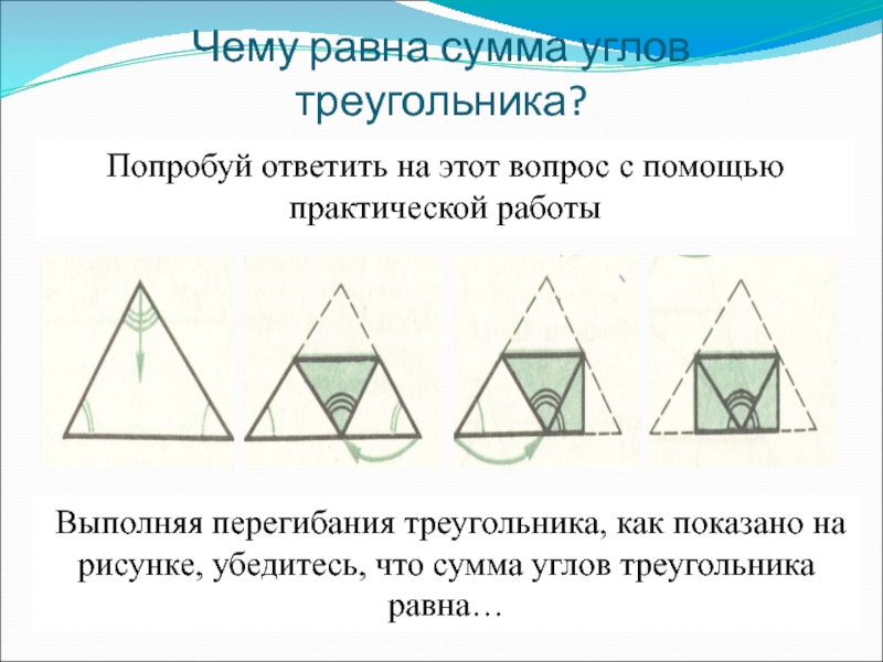Выполняя перегибания треугольника, как показано на рисунке, убедитесь, что сумма углов треугольника равна…