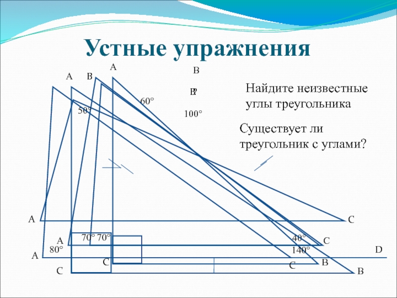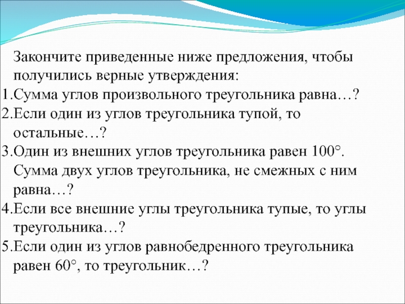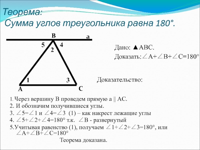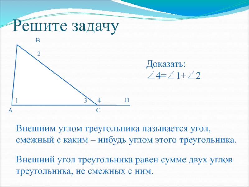 Внешний угол треугольника равен сумме двух углов треугольника, не смежных с ним.