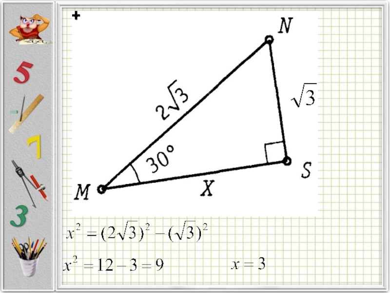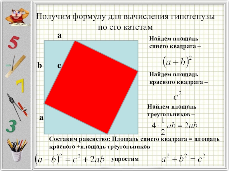 Составим равенство: Площадь синего квадрата = площадь красного +площадь треугольников