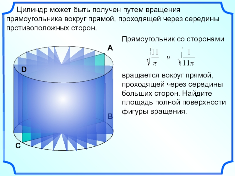вращается вокруг прямой, проходящей через середины больших сторон. Найдите площадь полной поверхности фигуры вращения.