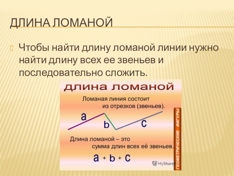 Длина ломанойЧтобы найти длину ломаной линии нужно найти длину всех ее звеньев и последовательно сложить.