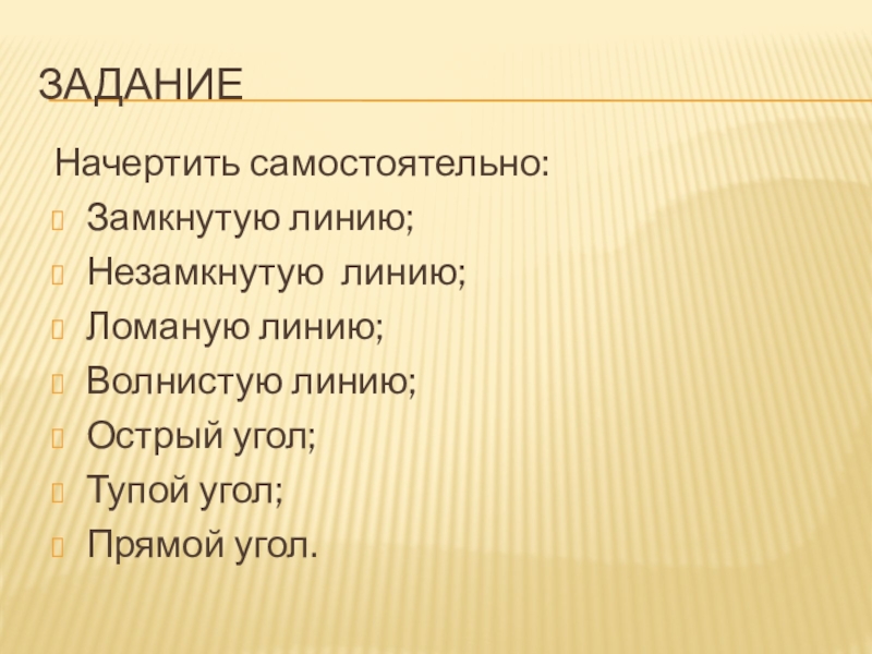 ЗаданиеНачертить самостоятельно:Замкнутую линию;Незамкнутую линию;Ломаную линию;Волнистую линию;Острый угол;Тупой угол;Прямой угол.