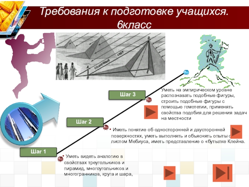 Уметь на эмпирическом уровне распознавать подобные фигуры, строить подобные фигуры с помощью гомотетии, применять свойства подобия для решения задач на местности