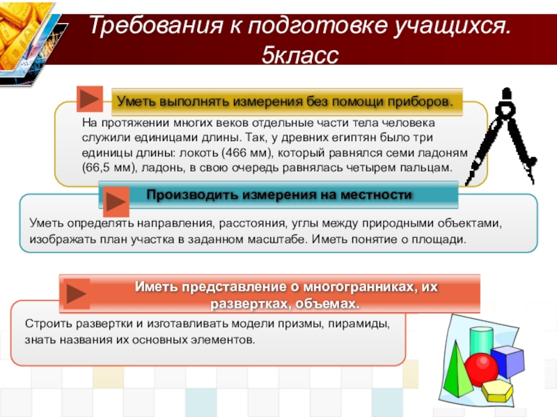 Уметь определять направления, расстояния, углы между природными объектами, изображать план участка в заданном масштабе. Иметь понятие о площади.