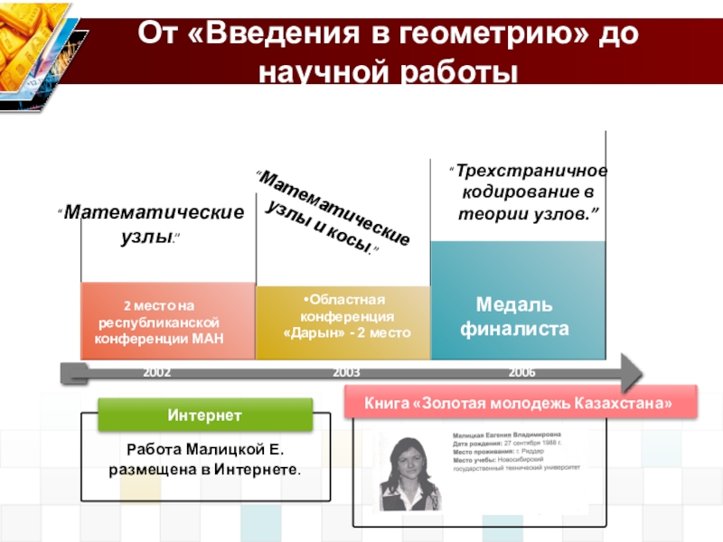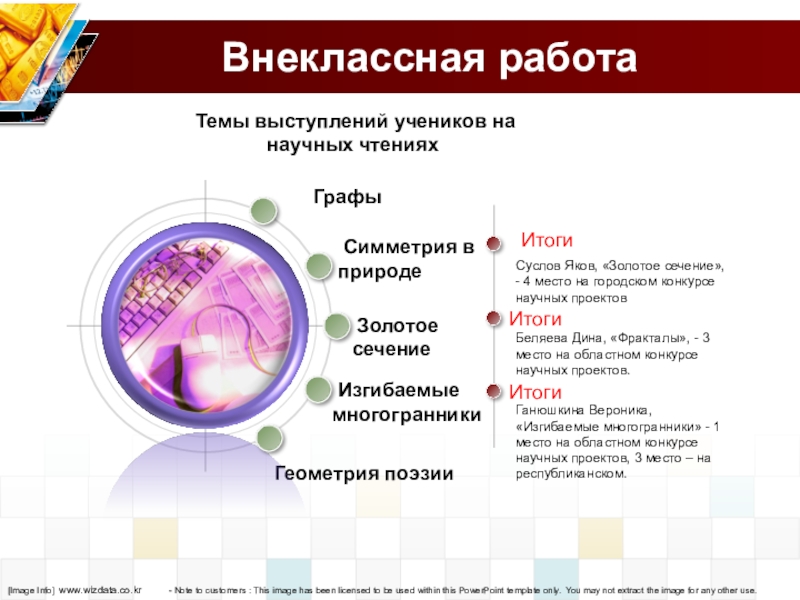 Ганюшкина Вероника, «Изгибаемые многогранники» - 1 место на областном конкурсе научных проектов, 3 место – на республиканском.