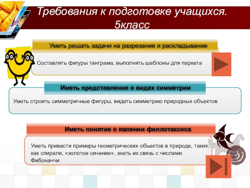 Уметь привести примеры геометрических объектов в природе, таких, как спирали, «золотое сечение», знать их связь с числами Фибоначчи