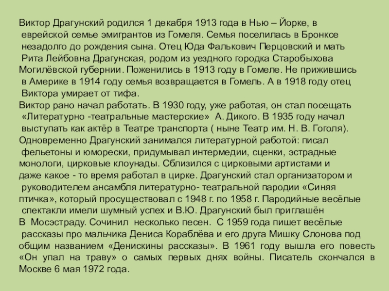 Виктор Драгунский родился 1 декабря 1913 года в Нью – Йорке, в еврейской семье эмигрантов из Гомеля.