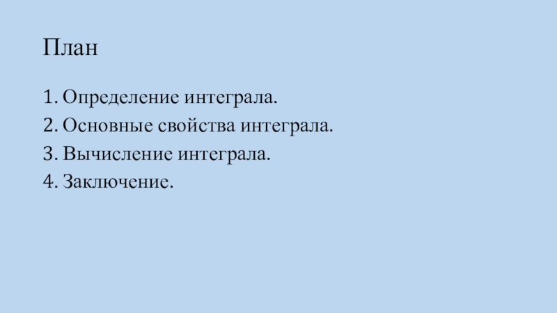План1. Определение интеграла.2. Основные свойства интеграла.3. Вычисление интеграла.4. Заключение.