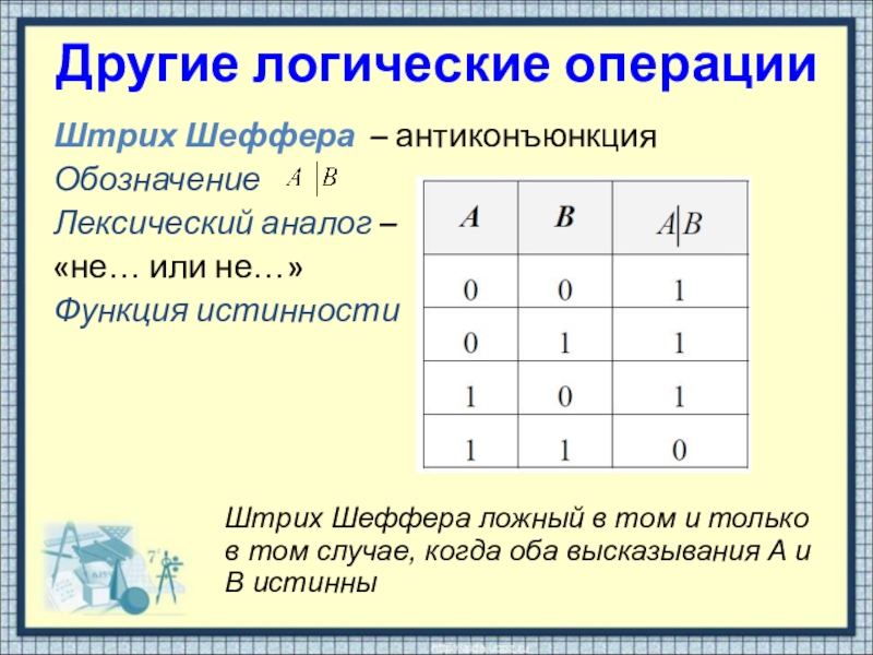 Штрих Шеффера ложный в том и только в том случае, когда оба высказывания A и B истинны