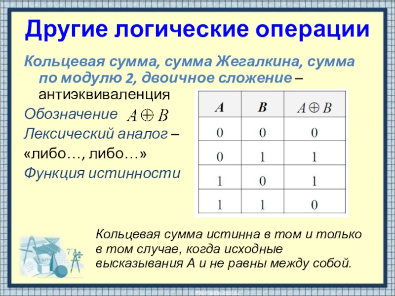 Кольцевая сумма истинна в том и только в том случае, когда исходные высказывания A и не равны между собой.