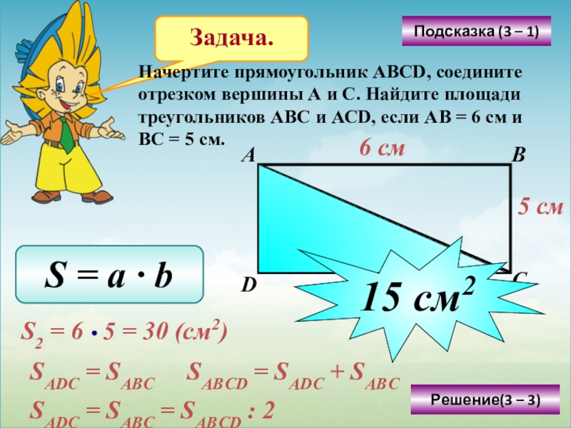 Одна сторона прямоугольника 5 дм, а другая в 3 раза больше. Найдите площадь этого прямоугольника
