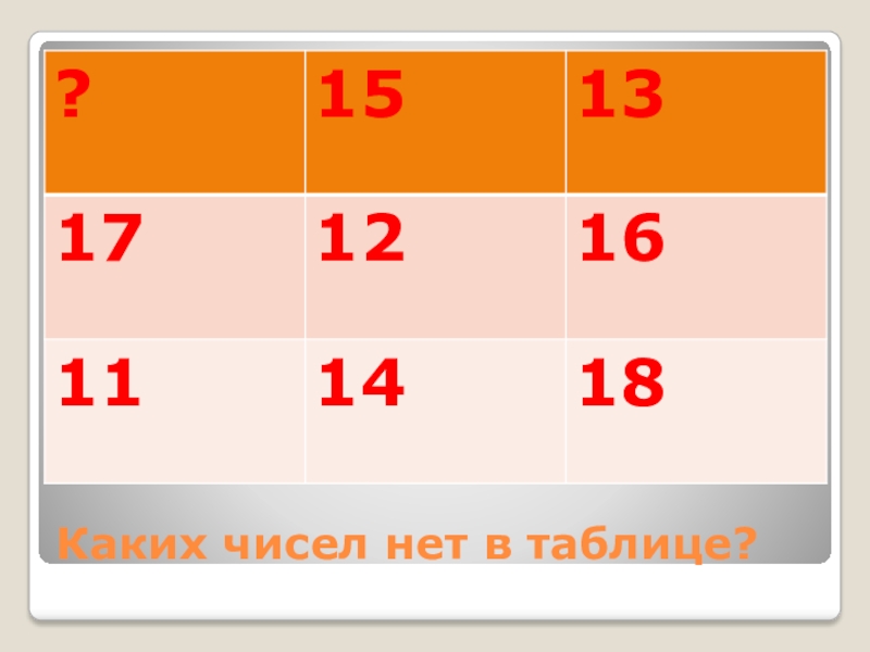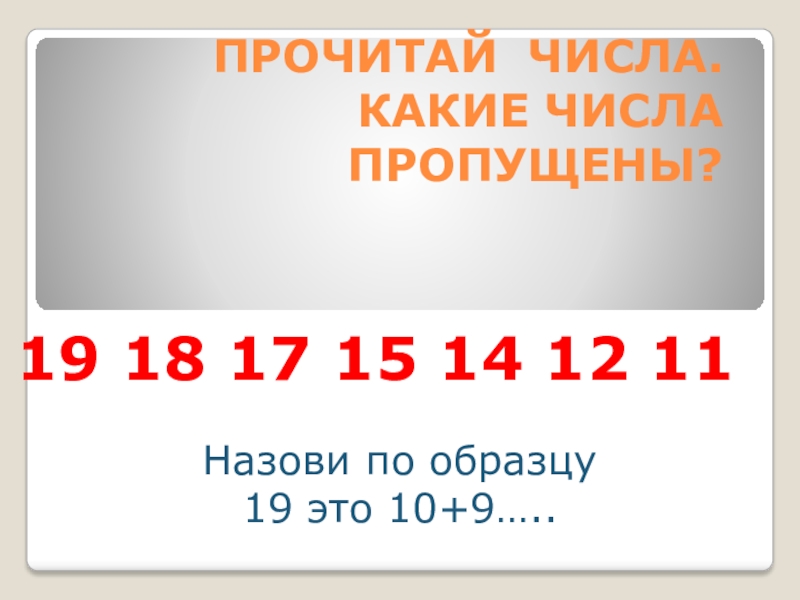 ПРОЧИТАЙ ЧИСЛА.КАКИЕ ЧИСЛА ПРОПУЩЕНЫ?19 18 17 15 14 12 11 Назови по образцу19 это 10+9…..