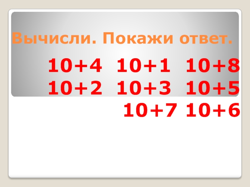 Вычисли. Покажи ответ.10+4 10+1 10+8 10+2 10+3 10+5 10+7 10+6