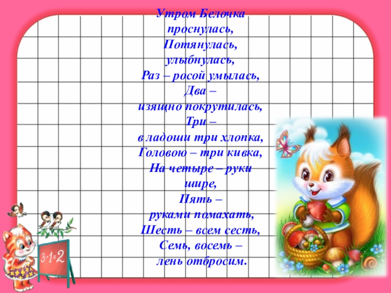 Утром Белочка проснулась,Потянулась, улыбнулась,Раз – росой умылась,Два – изящно покрутилась,Три – в ладоши три хлопка,Головою – три