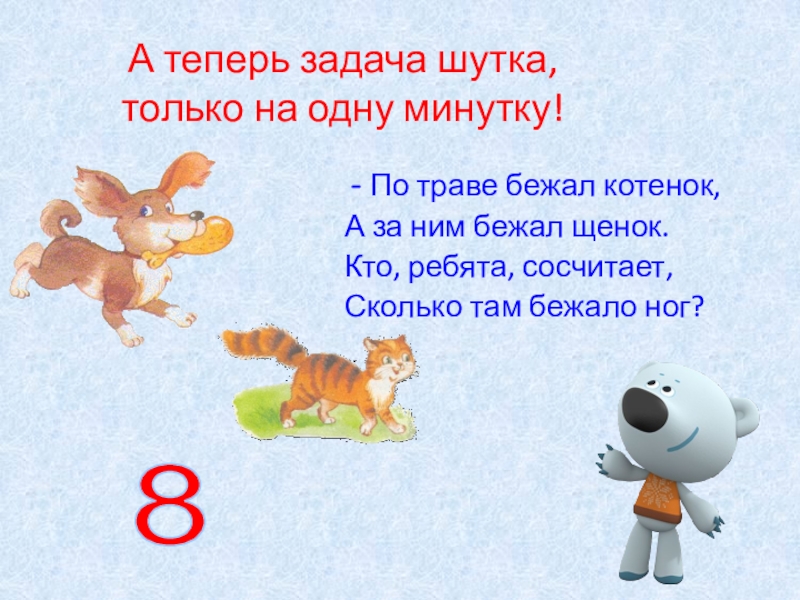 А теперь задача шутка, только на одну минутку! По траве бежал котенок,А за ним бежал щенок.Кто, ребята,