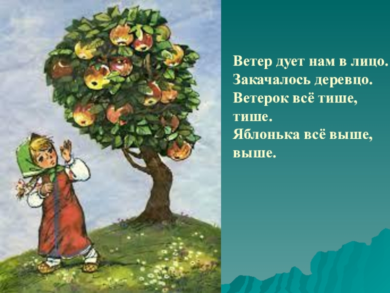Слайд 10Ветер дует нам в лицо. Закачалось деревцо. Ветерок всё тише, тише. Яблонька всё выше,