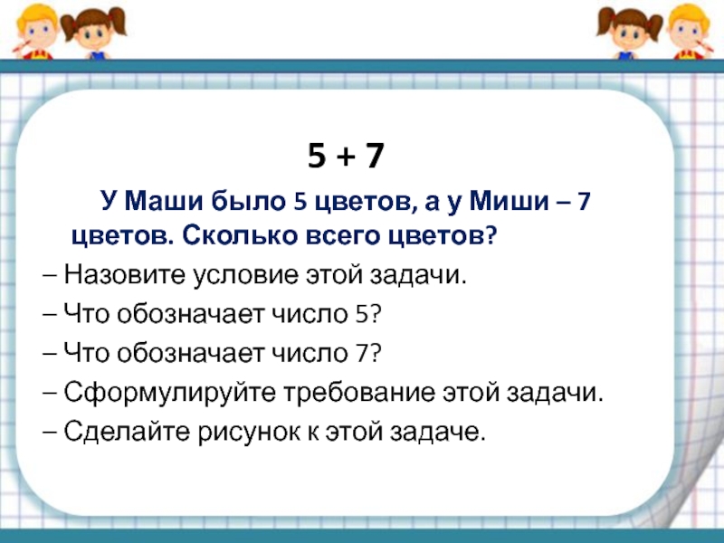 У Маши было 5 цветов, а у Миши – 7 цветов. Сколько всего цветов?