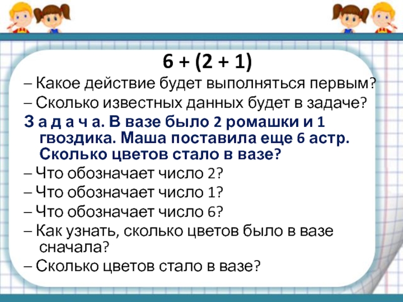 З а д а ч а. В вазе было 2 ромашки и 1 гвоздика. Маша поставила еще 6 астр. Сколько цветов стало в вазе?
