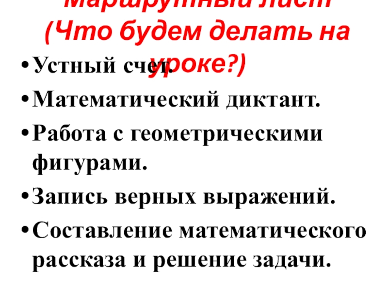 Маршрутный лист (Что будем делать на уроке?) Устный счет.Математический диктант.Работа с геометрическими фигурами.Запись верных выражений.Составление математического