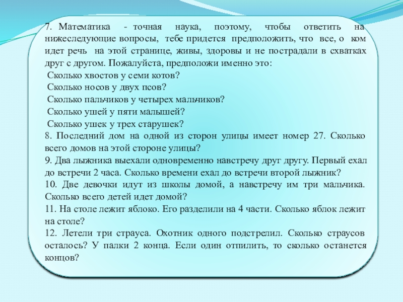 Слайд 107. Математика - точная наука, поэтому, чтобы ответить на нижеследующие вопросы,