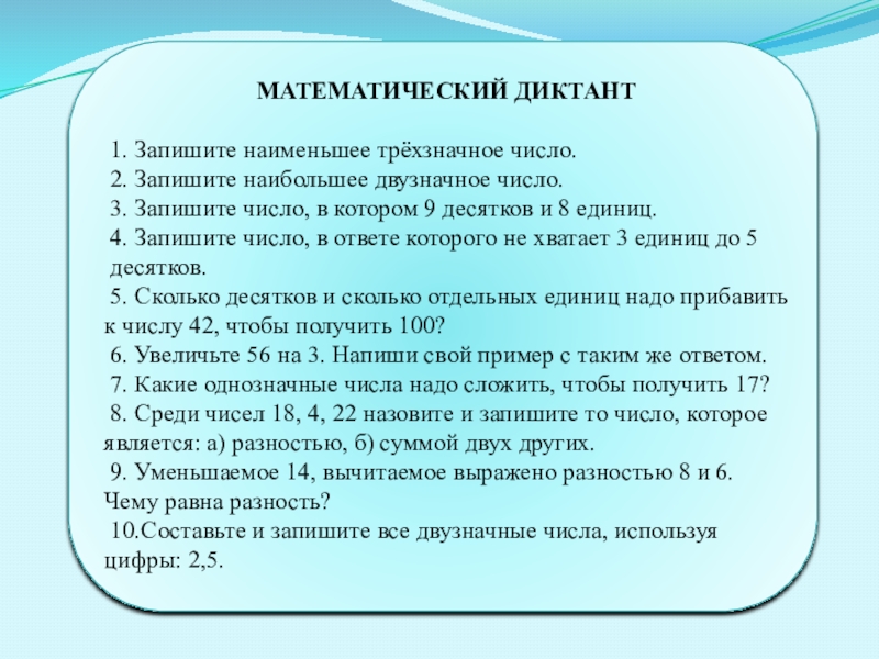 Слайд 5МАТЕМАТИЧЕСКИЙ ДИКТАНТ