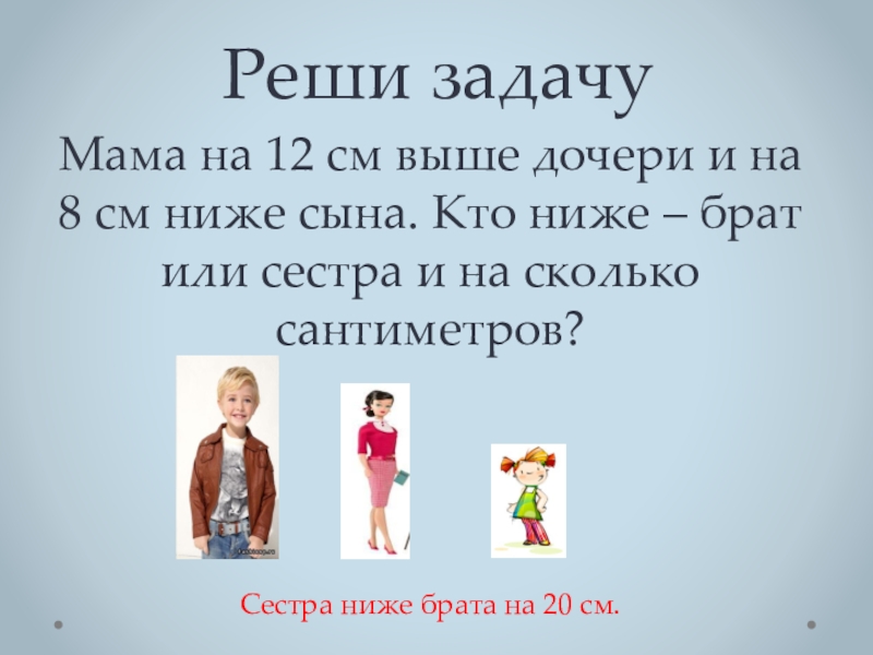 Реши задачуМама на 12 см выше дочери и на 8 см ниже сына. Кто ниже – брат