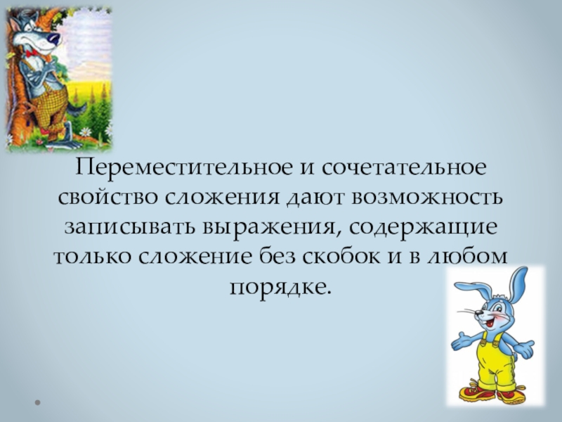 Слайд 14 Переместительное и сочетательное свойство сложения дают возможность записывать выражения, содержащие только