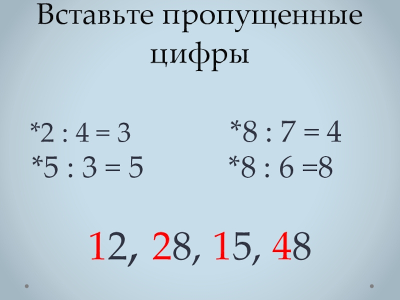 Вставьте пропущенные цифры *2 : 4 = 3