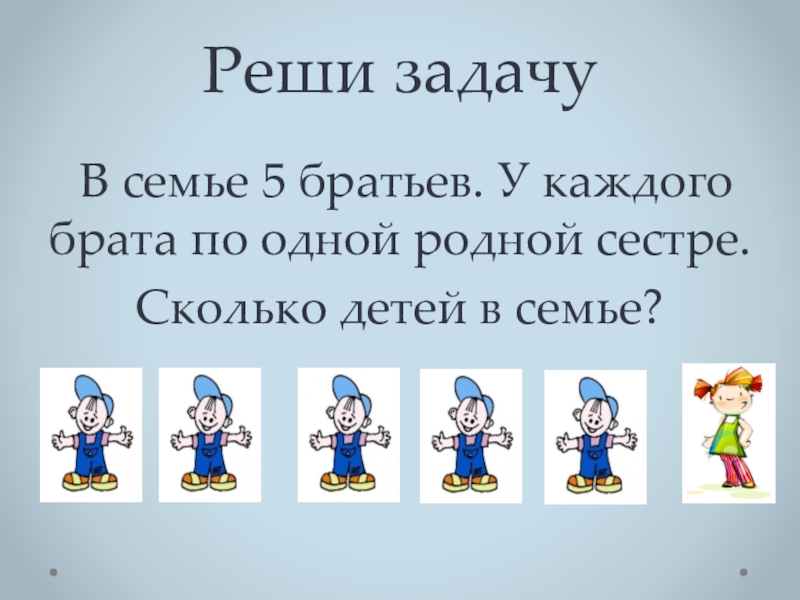 Реши задачу  В семье 5 братьев. У каждого брата по одной родной сестре. Сколько детей в