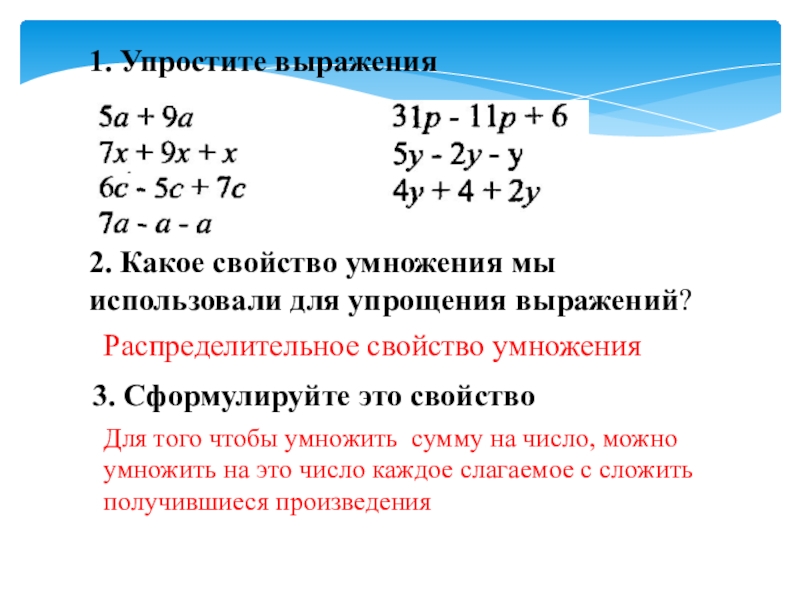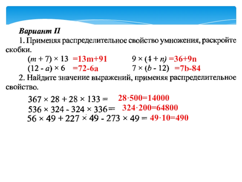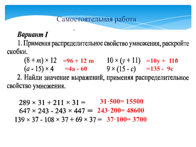 Для того чтобы умножить сумму на число, можно умножить на это число каждое слагаемое с сложить получившиеся произведения