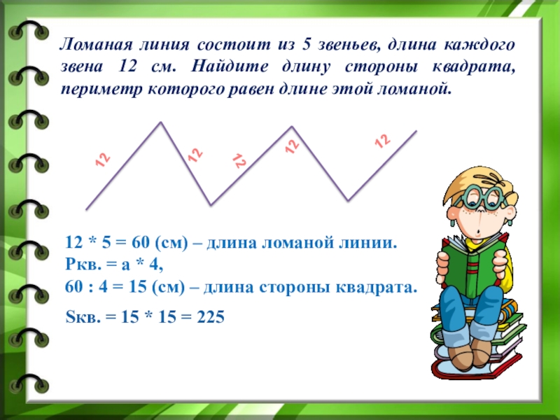 12 * 5 = 60 (см) – длина ломаной линии. Pкв. = а * 4,